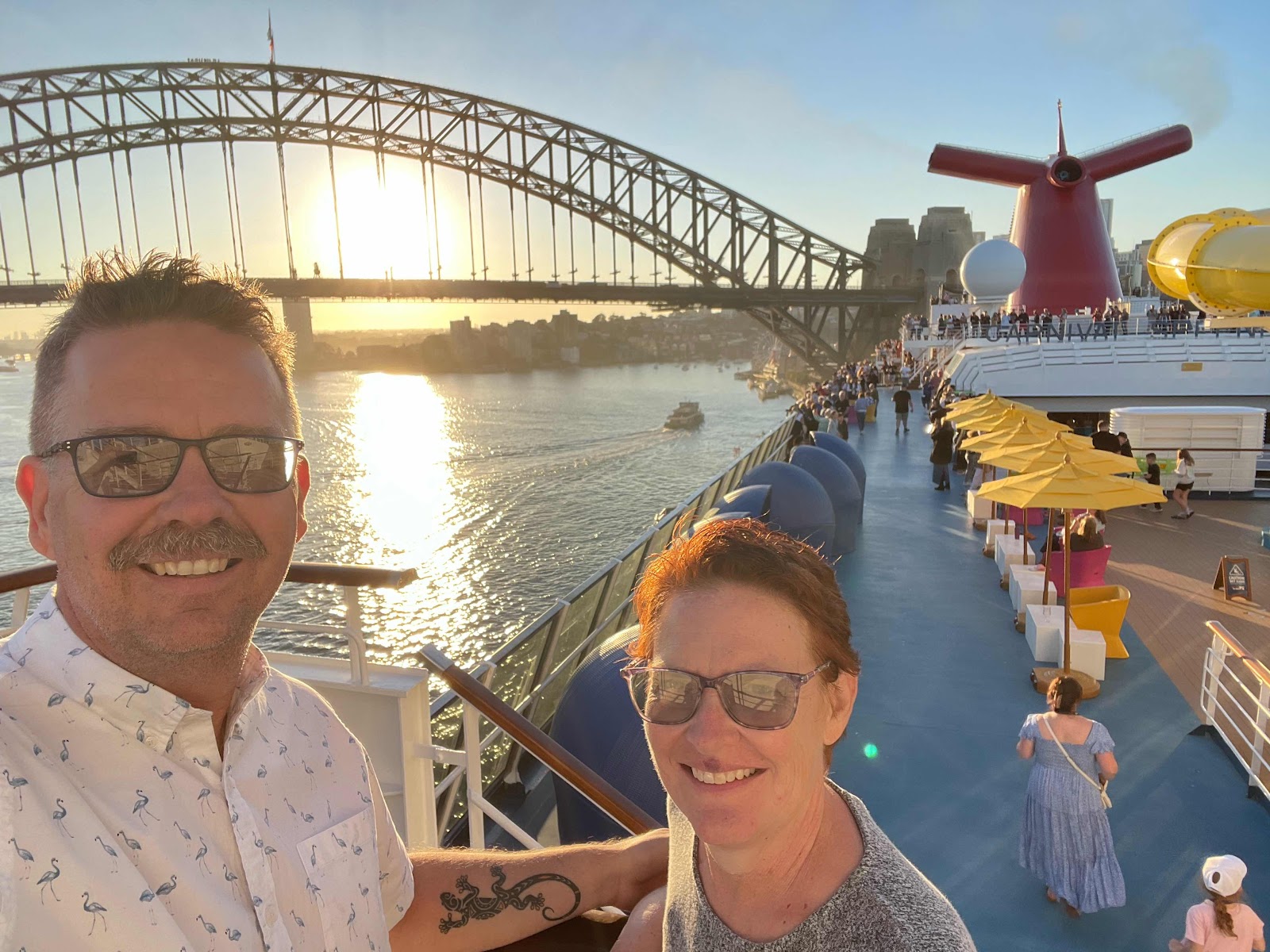 We got up and had coffee and a protein bar before packing up to head to the cruise terminal. We Ubered this morning. One can build in a couple extra stops before the destination, which we’ve never done before today, but we needed to go to a pharmacy to pick up a few things. The driver waited as Jim ran in. The pharmacy was located in an area called Newtown and on the way to the terminal. It’s an older, trendier area which looked like a place to come back to. The driver told us it has a lot of good restaurants and suggested a couple. Our first impressions are that Sydney gives off vibes of Los Angeles x San Francisco.