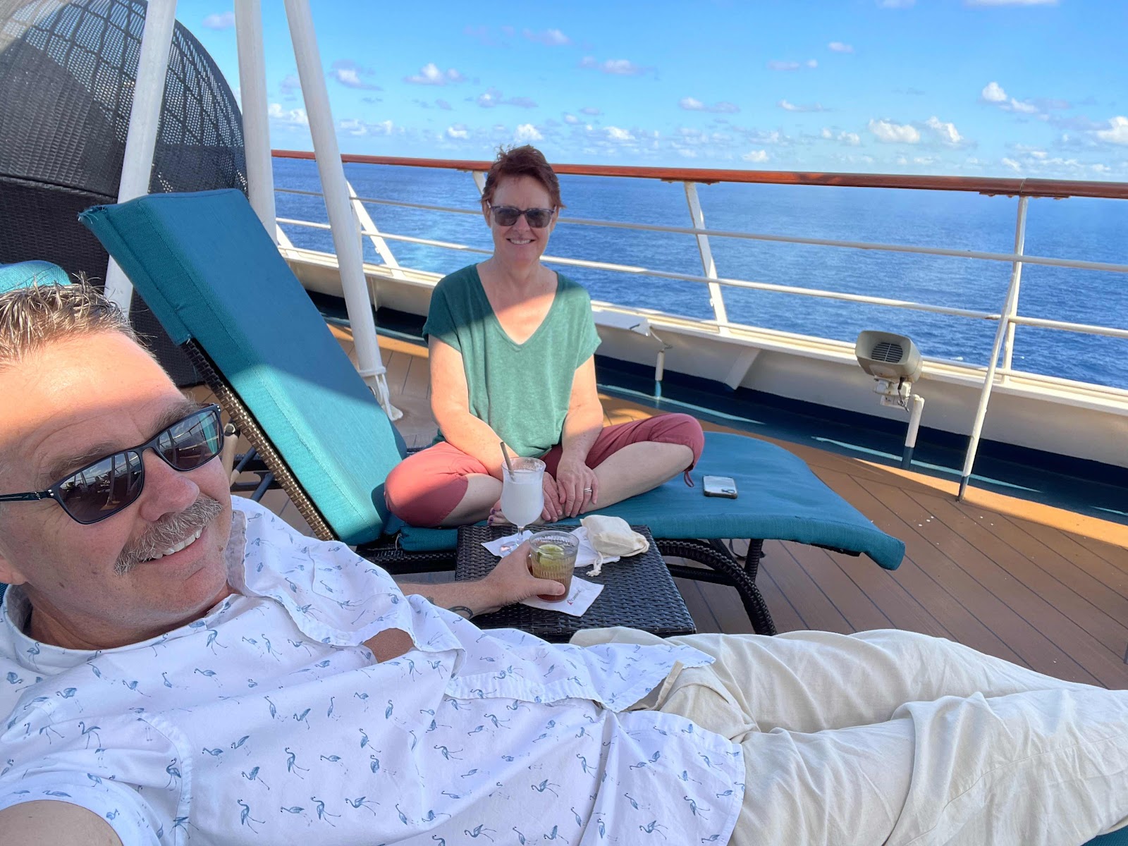 We finally made it out and about at 11AM. After a little window shopping we settled at the adults-only pool area. The weather is incredible today. Picture the perfect temperature at the pool or beach, add sunny skies and a gentle breeze … oh, drinks delivered to your deck chair if you wish. We played cribbage and enjoyed it all.