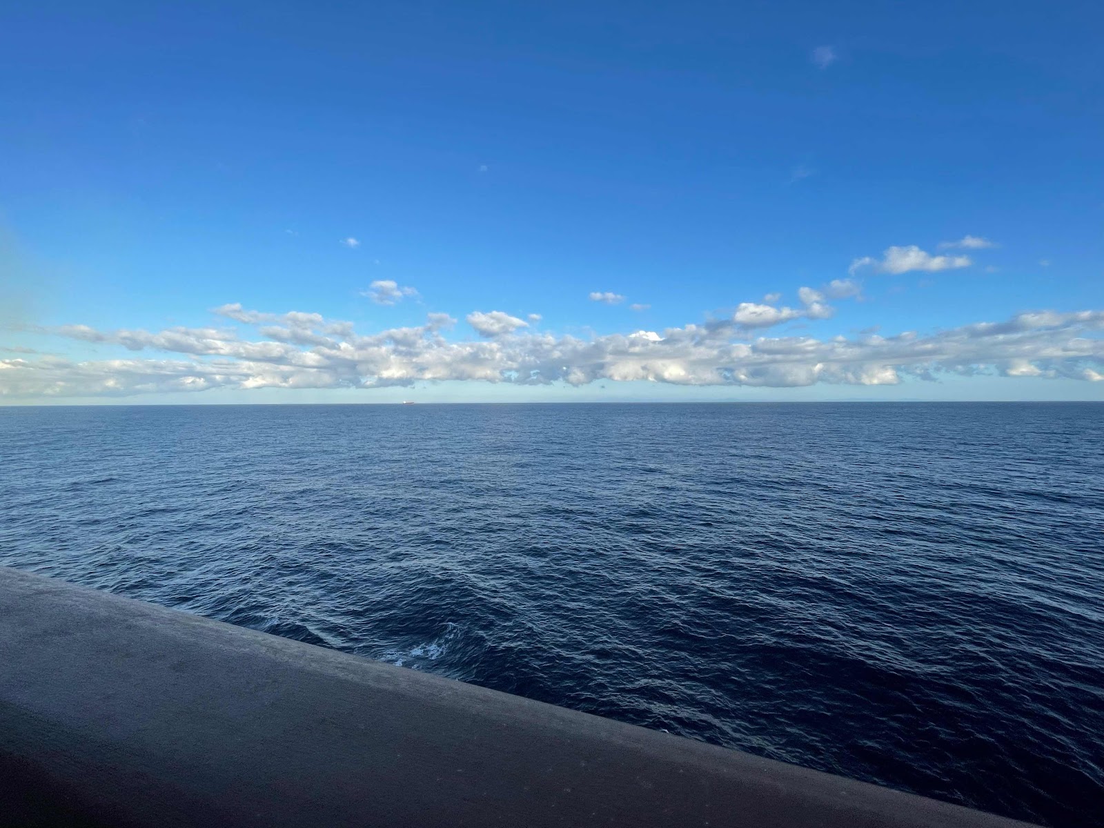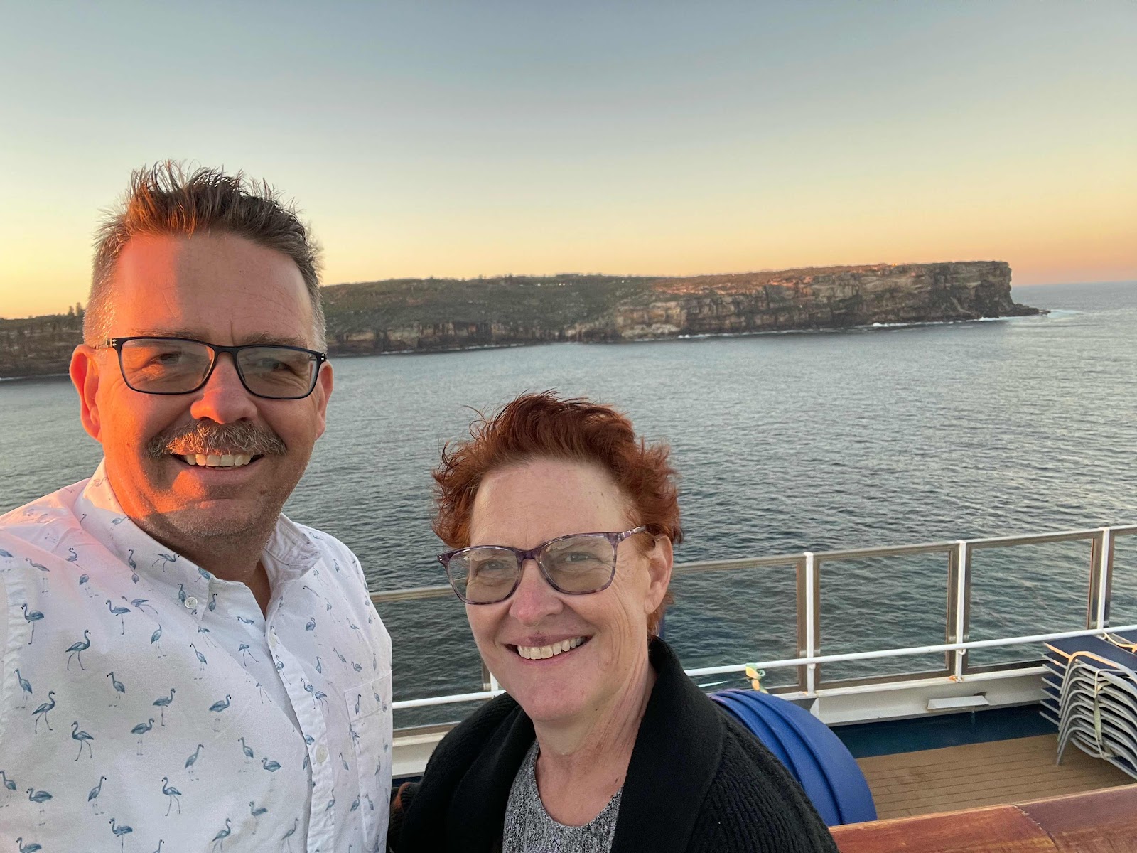 Jim woke up too early — ๐. He went up to get coffee. They have automatic espresso machines in the buffet so no need to buy the premium coffee, not that we would anyway. Kristi usually wakes up early to take her medications, but the medications put her back to sleep for a while. Jim spent some time sitting on the balcony drinking coffee. The coast of Australia is visible in the distance; glad we are on the port side for the view as the morning is clear and the temperature is very comfortable. Seas have been relatively calm and this morning are very calm.
