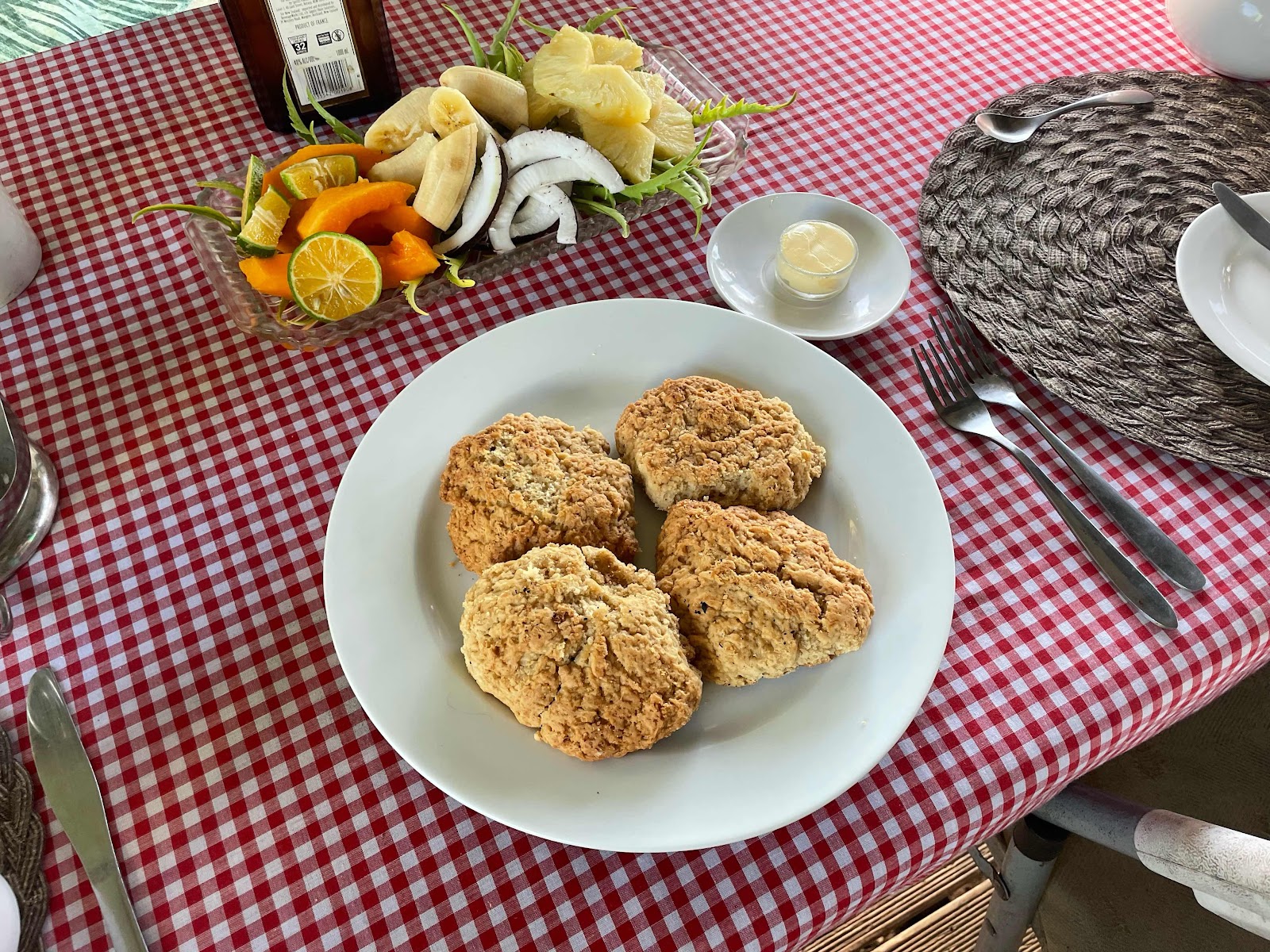 We had a bit of an early start today to be ready for our snorkeling adventure. Sia, and Charlie her husband, who came home yesterday after a few days out fishing, put out breakfast. Today, in addition to fresh fruit and eggs, Sia made coconut scones. Everything was delicious as usual.