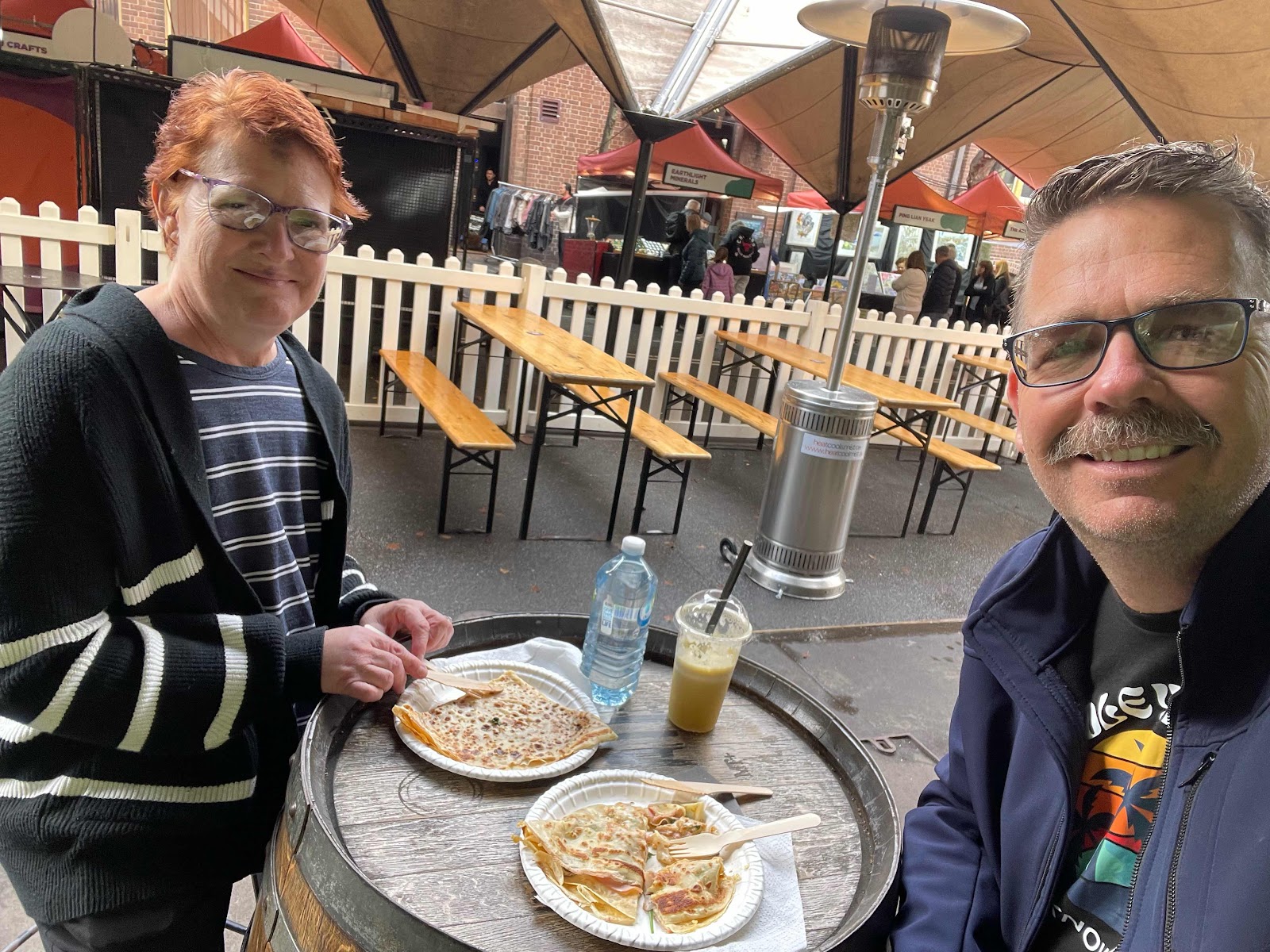 Our street turned into a Saturday market this morning. Yes, it’s a Saturday. We think we are 19 hours ahead of Pacific time. We were able to get up, take a stroll, and have crepes for breakfast before catching an Uber to the airport at about 10:45AM.