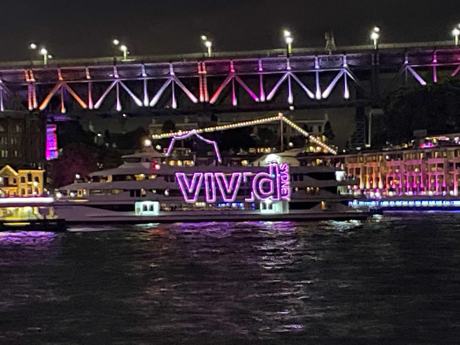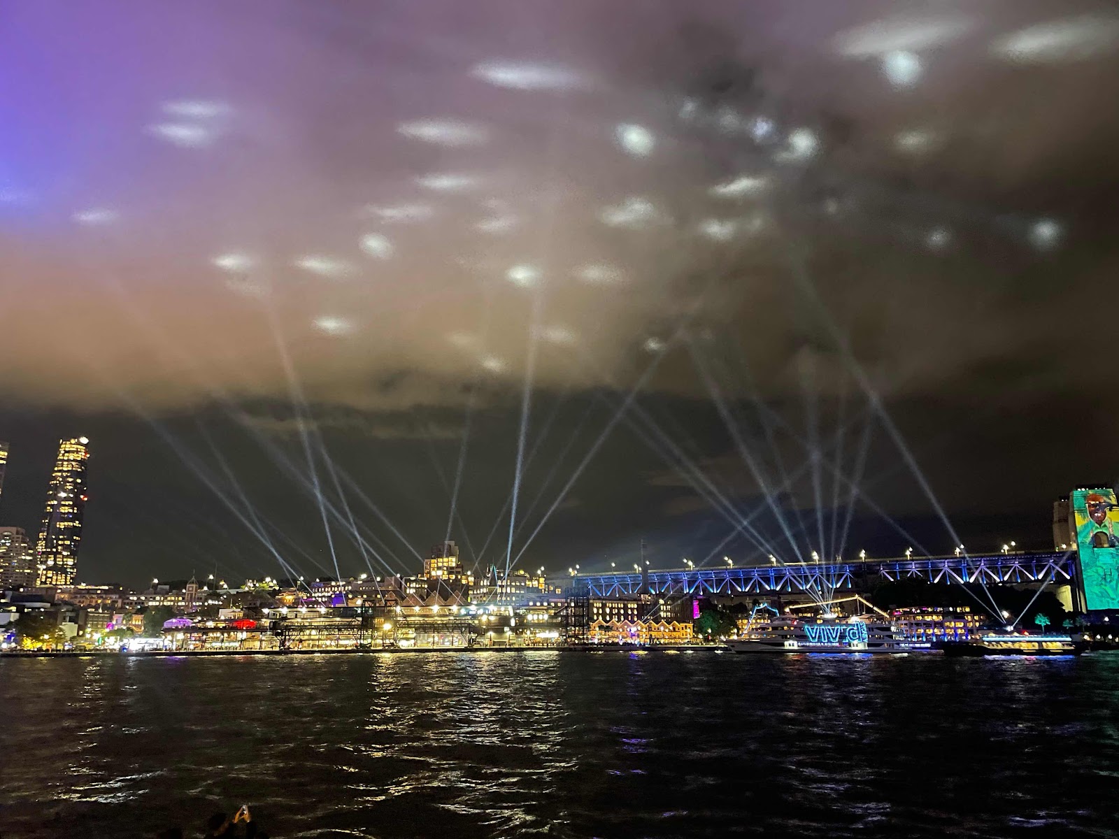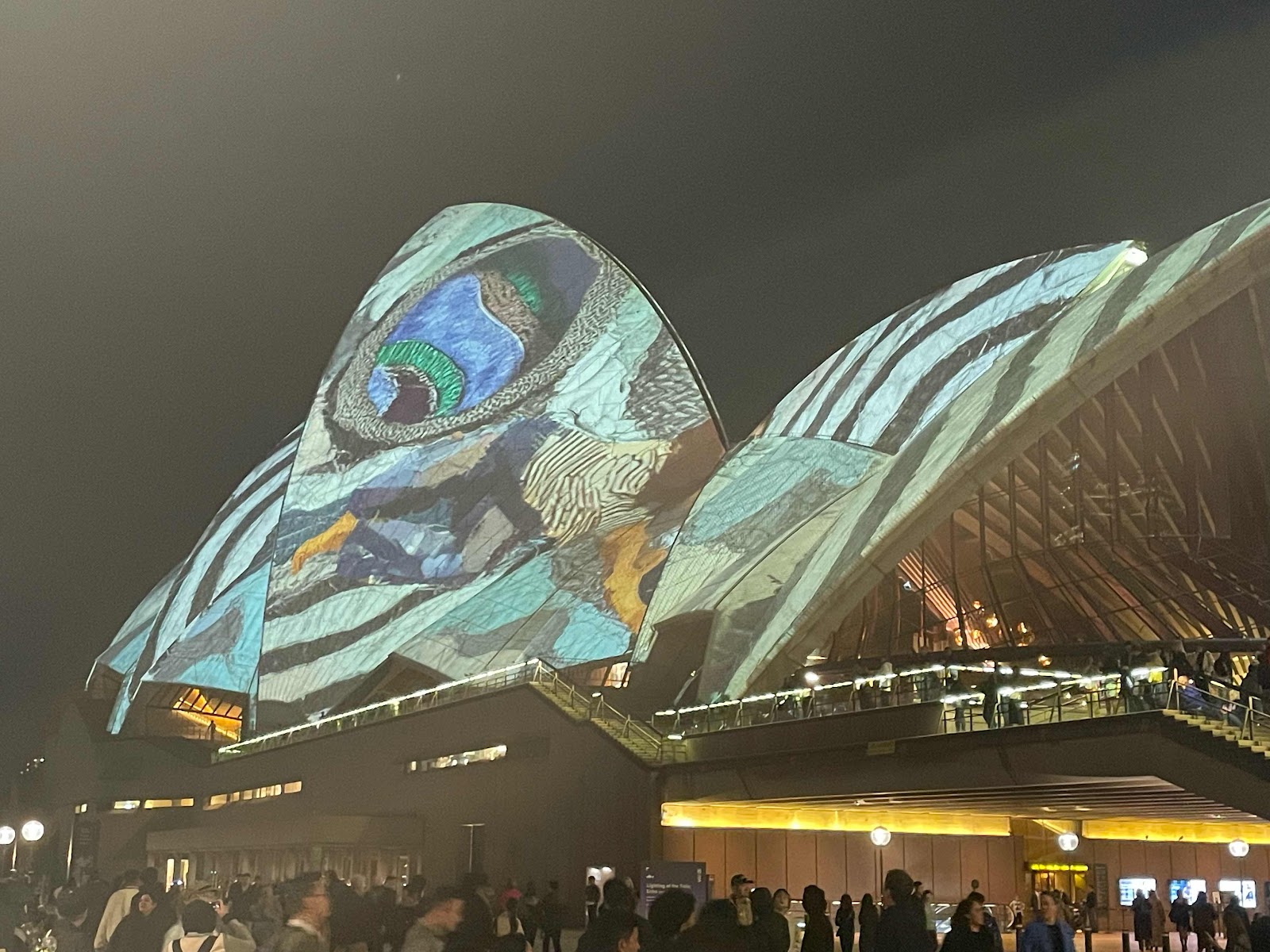 We made the leisurely walk around the waterfront to the Opera House. We lucked out again. Vivid Sydney is an annual light festival; lasers and projections happen for several hours starting at 6:00PM. And, some streets are closed to traffic and lined with food vendors. We had grilled chicken and pork on a stick as we walked.
